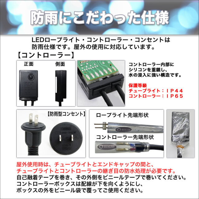 QUALISS クオリス クリスマス イルミネーション 3芯 角型 防滴 チューブライト ロープライト 2500 LED / 50m Bタイプ コントローラー セット 28種類点滅 常時点灯可 点滅パターン記憶可 AC100V 50Hz 60Hz 【全9色】【CL003】