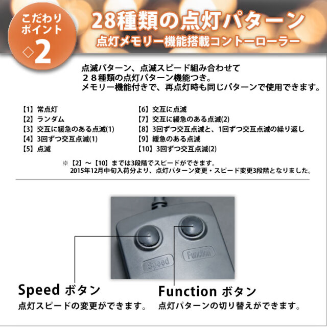 ・メモリー機能付きで、一度消灯して再点灯した場合でも同じ点灯パターンが楽しめます。