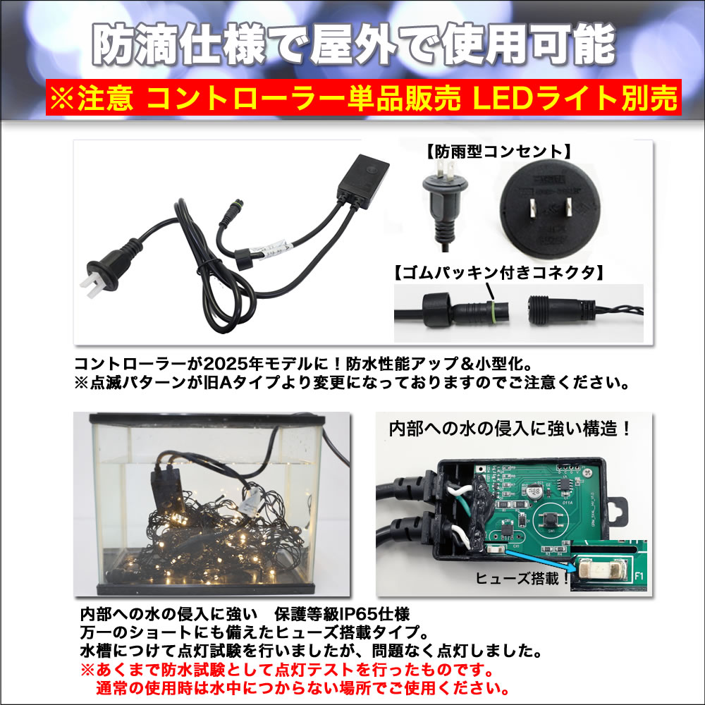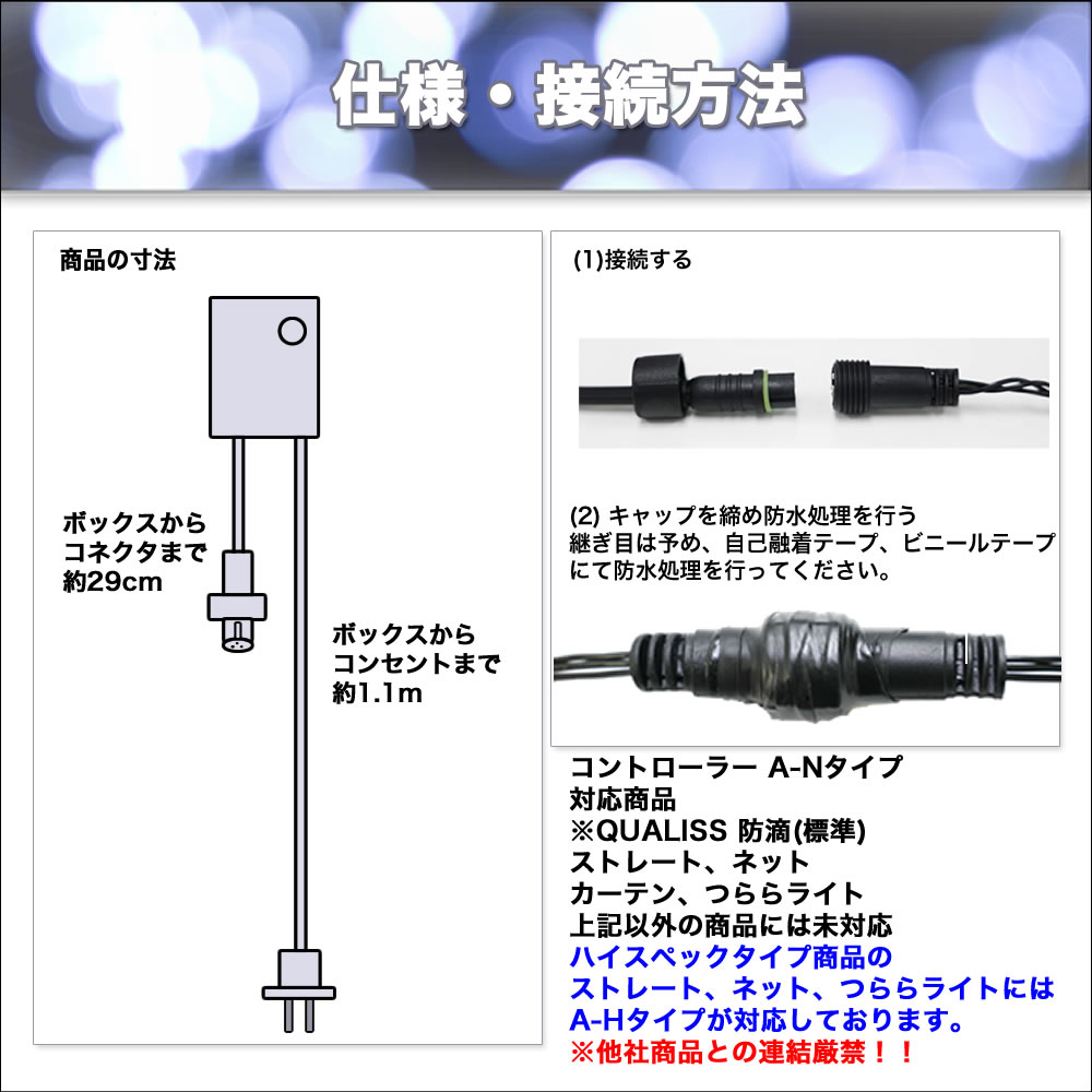 ・QUALISS 標準防滴 ストレート、ネットライト、つららライト、カーテンライト用電源コントローラーのみ 単品販売です。LEDライトは付属しません。標準防雨タイプに対応します。