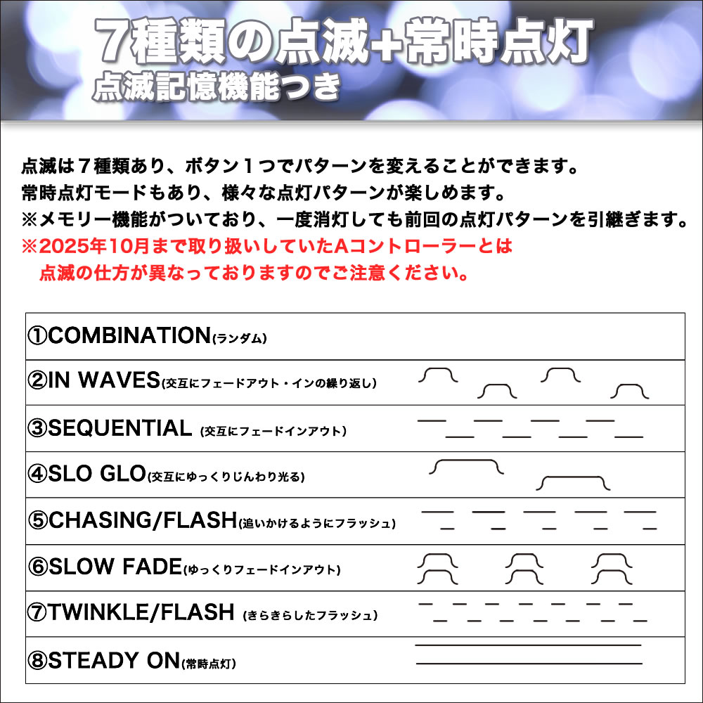 ・点滅パターン7種類、常時点灯のモードがあります。旧Aタイプとは点滅パターンが異なりますのでご注意ください。