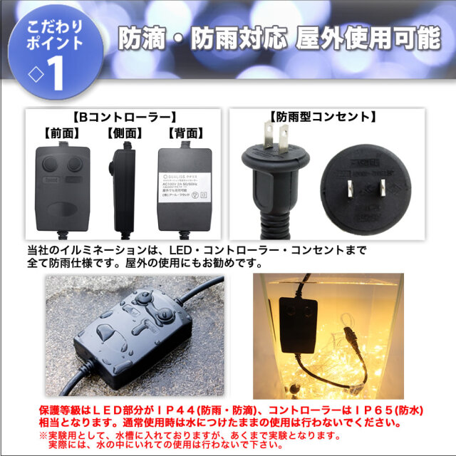 ライト、コントローラー、コンセントとも防滴仕様で屋外での使用も可能です。