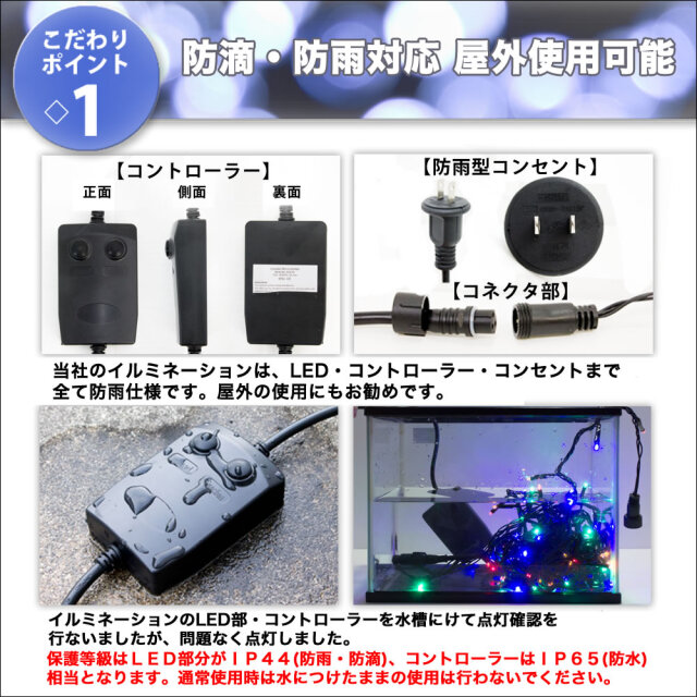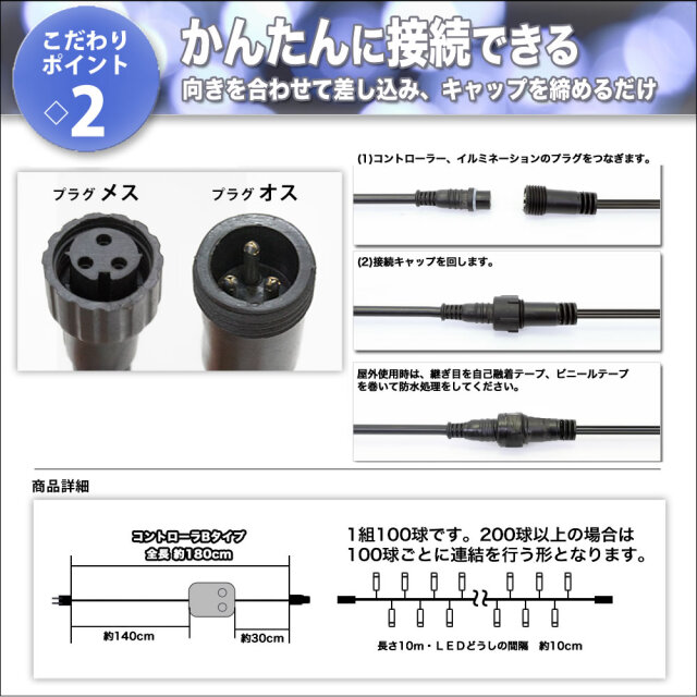 ・防水性能を維持する為、キャップはしっかり締めてください。また、屋外での使用の場合、イルミネーションのコネクタ部分のつなぎめに自己融着テープを巻き、その外側をビニールテープを巻いてご使用ください。
